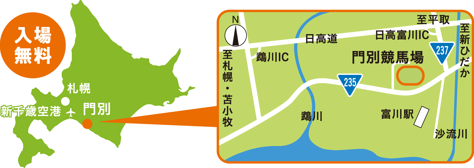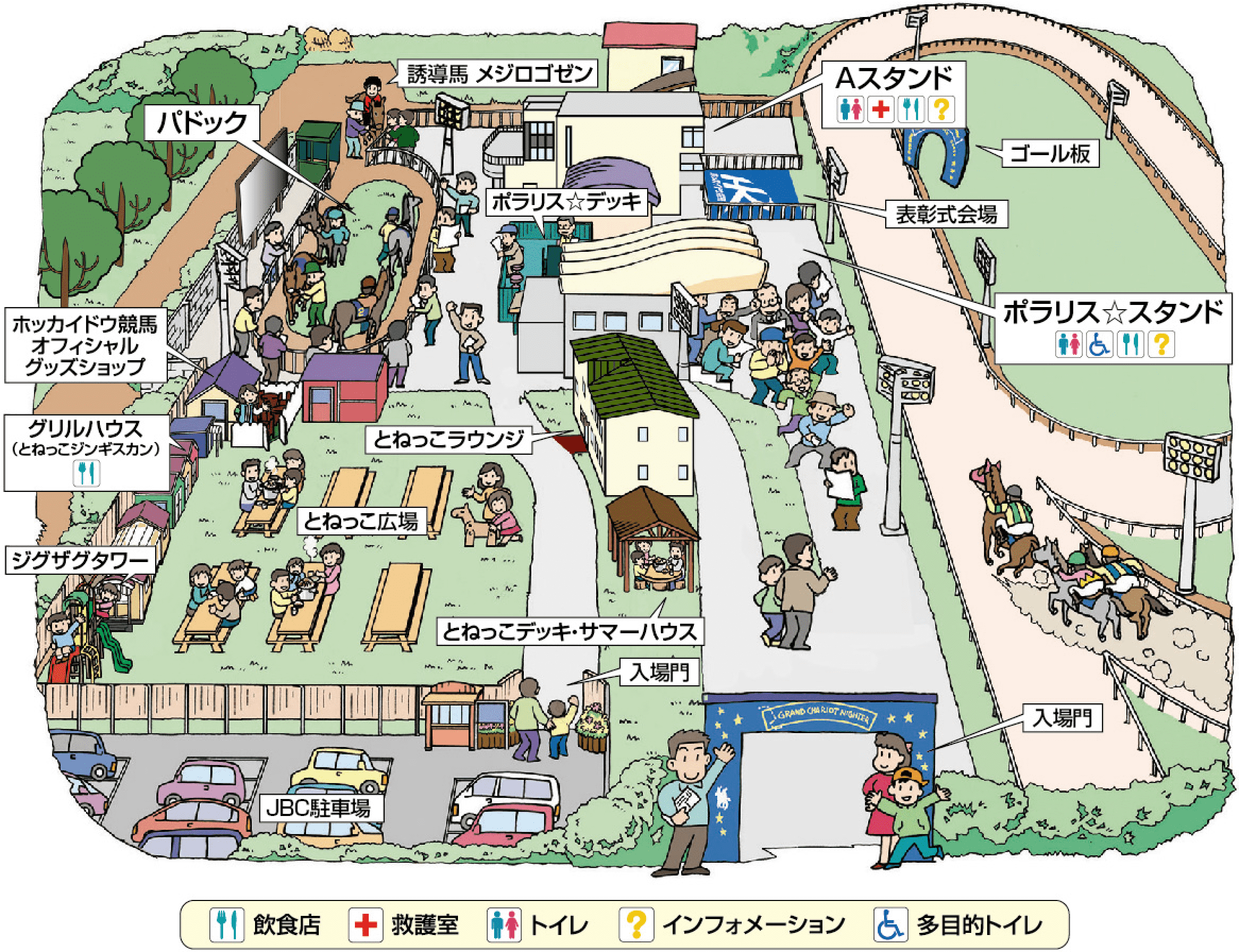 ⾨別競⾺場に⾜を運べば、馬の息吹が感じられるほど距離が近いパドック、芝⽣でくつろげる「とねっこ広場」、ジンギスカンをはじめとした地元⾷材のグルメなど、お⼦様と⼀緒に楽しめるスポットが⼊場無料でお楽しみいただけます!